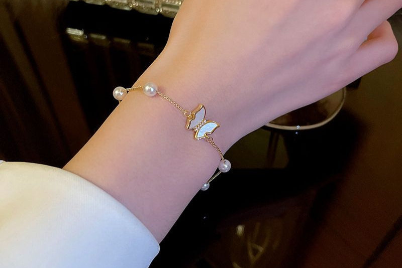 Elevate your style with this exquisite stainless steel bracelet featuring a delicate pearl butterfly design. Its elegant craftsmanship offers a refined accessory that complements any outfit, perfect for those seeking subtle sophistication. Available now for only 600.